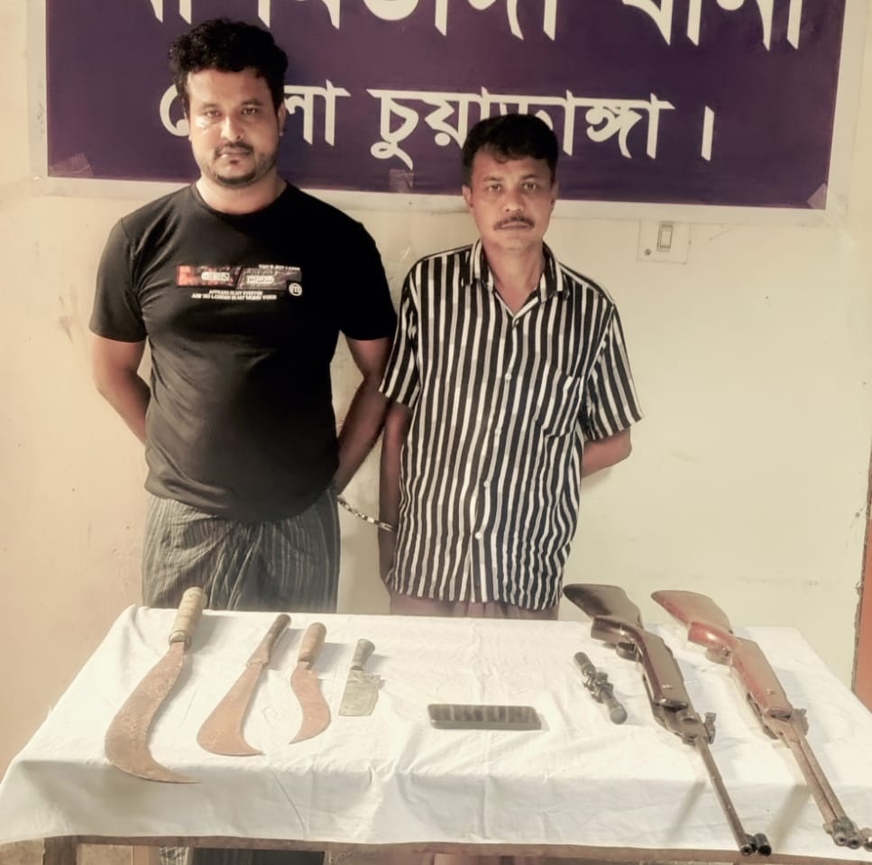 বাংলাদেশ সেনাবাহিনী অস্থায়ী ক্যাম্প হারদী, আলমডাঙ্গা এর অফিসার বিএ-১০৯৪৯ ক্যাপ্টেন সৌমিক আহমদে অয়ন এর নেতৃত্বে বাদী এসআই(নিঃ) এসএম নিয়ামুল হক, সঙ্গীয় ফোর্সসহ যৌথ অভিযান পরিচালনাকালে গোপন সংবাদের ভিত্তিতে আলমডাঙ্গা পৌরসভার এরশাদপুর গ্রামের মৃত ফজলুর রহমানের ছেলে রুহুল আমিন(৪৫) ও নওদাবন্ডবিল গ্রামের ঠান্ডু রহমানের ছেলে তারফি হাসান কে দেশীয় অস্ত্রসহ গ্রেফতার করা হয় তাদের বসত বাড়ি থেকে।
