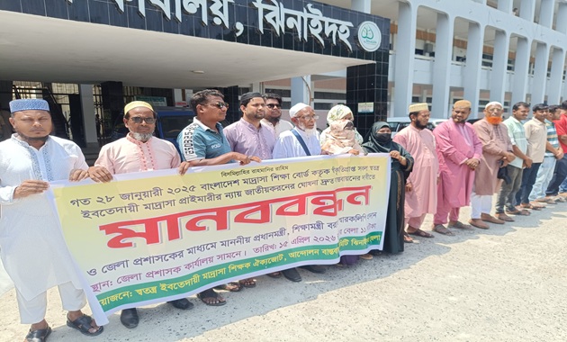 বুধবার সকালে ঝিনাইদহ জেলা প্রশাসকের কার্যালয়ের সামনে এ কর্মসূচীর আয়োজন করে স্বতন্ত্র ইবতেদায়ী মাদ্রাসা শিক্ষক ঐক্যজোট।