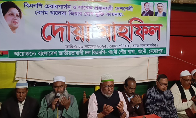 বাংলাদেশ জাতীয়তাবাদী দল (বিএনপি) চেয়ারপারসন ও সাবেক প্রধানমন্ত্রী বেগম খালেদা জিয়ার রোগমুক্তি কামনায় গাংনীতে এক দোয়া মাহফিল অনুষ্ঠিত হয়েছে।