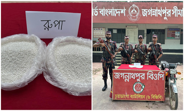 এসময় বিজিবি’র ২ জন সন্দেহভাজন ব্যক্তিকে মোটরসাইকেলযোগে উক্ত এলাকা দিয়ে সীমান্তের দিকে যেতে দেখে। সে সময় বিজিবি টহল দল তাদেরকে থামার জন্য সিগন্যাল প্রদান করলে, তারা মোটরসাইকেল নিয়ে পালিয়ে যাওয়ার চেষ্টা করে। পরে বিজিবি’র ধাওয়া খেয়ে মোটরসাইকেল ফেলে ২ চোরাকারবারী পাট ক্ষেতের মধ্যে পালিয়ে যায়। পরে মোটরসাইকেল তল্লাশি করে প্রায় ২২ লক্ষ টাকা মূল্যের দানাদার রুপা জব্দ করে।