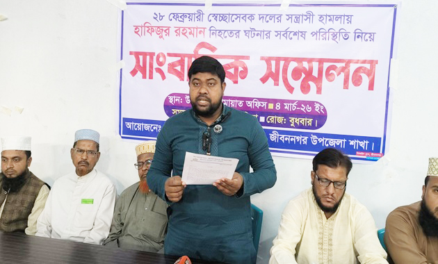 স্বেচ্ছাসেবক দলের নেতার হামলায় নিহত জামায়াত কর্মী হাফিজুর রহমান হত্যাকাণ্ডের সর্বশেষ পরিস্থিতি তুলে ধরা এবং দ্রুত, স্বাধীন ও নিরপেক্ষ তদন্তের দাবি জানাতে গতকাল বুধবার বিকেল ৪টায় উপজেলা কার্যালয়ে সাংবাদিক সম্মেলন করে বাংলাদেশ জামায়াতে ইসলামী’র জীবননগর শাখা।
