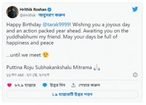 হিন্দুস্থান টাইমসের প্রতিবেদন অনুযায়ী, সম্প্রতি জুনিয়ার এনটিআরের জন্মদিনে টুইটারে তাকে শুভেচ্ছাবার্তায় যুদ্ধক্ষেত্রে নেমে পড়ার আহ্বান জানিয়েছেন হৃতিক রোশন। হৃতিক লিখেছেন, ‘শুভ জন্মদিন জুনিয়র এনটিআর! আনন্দে ভরে উঠুক তোমার আগামী দিন, অ্যাকশনে হোক জমজমাট। যুদ্ধভূমিতে তোমার জন্য অপেক্ষায় আছি বন্ধু। তোমার আগামী দিনগুলো আনন্দ আর শান্তিতে ভরে উঠুক, যতক্ষণ না আমাদের দেখা হচ্ছে।’