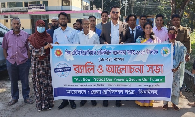 বিশ্ব এন্টিমাইক্রোবিয়াল রেজিস্ট্যান্স সচেতনতা সপ্তাহ উপলক্ষে ঝিনাইদহে র্যালি ও আলোচনা সভা অনুষ্ঠিত হয়েছে। মঙ্গলবার সকালে জেলা প্রানিসম্পদ কার্যলয় হতে একটি র্যালি বের হয়।