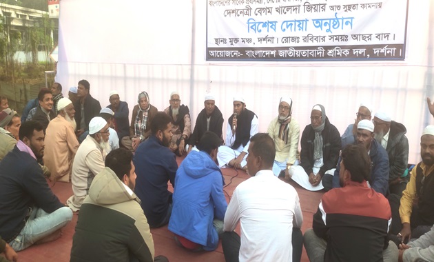 দর্শনায় জাতীয়তাবাদী শ্রমিকদলের উদ্যোগে সাবেক প্রধানমন্ত্রী বেগম খালেদা জিয়ার রোগমুক্তি ও সুস্থতা কামনায় দোয়া মাহফিল অনুষ্ঠিত হয়েছে।