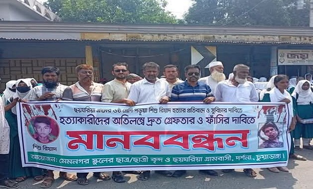 চুয়াডাঙ্গা জেলার দামুড়হুদা উপজেলার ছয়ঘরি গ্রামে ষষ্ঠ শ্রেণির স্কুলছাত্র রিয়াদ হোসেন (১৩) কে প্রকাশ্যে কুপিয়ে হত্যার ঘটনায় জড়িতদের ফাঁসির দাবিতে মানববন্ধন অনুষ্ঠিত হয়েছে।