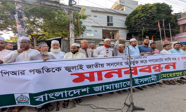 পিআর পদ্ধতিকে জুলাই জাতীয় সনদের অন্তর্ভুক্ত করে গণভোটের দাবিতে মেহেরপুরে মানববন্ধন করেছে বাংলাদেশ জামায়াতে ইসলামী মেহেরপুর জেলা শাখা।