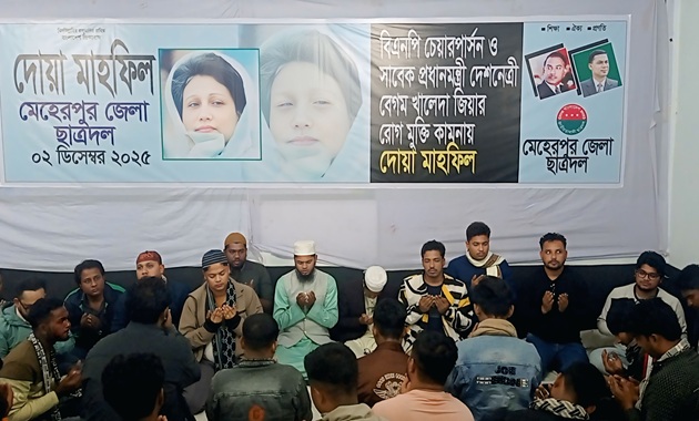 বিএনপি চেয়ারপার্সন ও সাবেক প্রধানমন্ত্রী বেগম খালেদা জিয়ার রোগমুক্তি কামনায় মুজিবনগরে মেহেরপুর জেলা ছাত্রদলের উদ্যোগে দোয়া মাহফিল অনুষ্ঠিত হয়েছে।