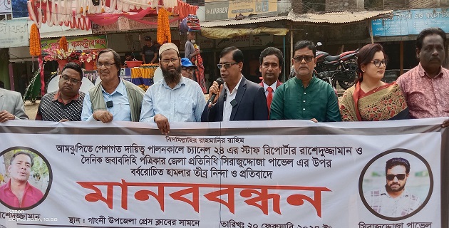 আজ মঙ্গলবার (২০ ফেব্রুয়ারি) সকাল সাড়ে ১০টার দিকে গাংনী উপজেলা প্রেসক্লাবের সামনে মেহেরপুর-কুষ্টিয়া সড়কের পাশে এই মানববন্ধন অনুষ্ঠিত হয়।