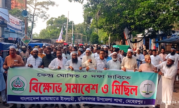 মুজিবনগরে কেন্দ্র ঘোষিত জুলাই জাতীয় সনদের ভিত্তিতে ফেব্রুয়ারিতে নির্বাচনসহ ৬-দফা দাবিতে বাংলাদেশ জামায়াতে ইসলামী মুজিবনগর উপজেলা শাখার সমাবেশ ও বিক্ষোভ মিছিল অনুষ্ঠিত হয়েছে।