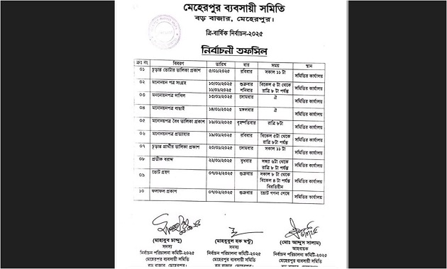 মেহেরপুর বড় বাজার ব্যবসায়ী সমিতির ত্রি-বার্ষিক নির্বাচন অনুষ্ঠিত হতে যাচ্ছে। সম্প্রতি নির্বাচন পরিচালনা কমিটি আনুষ্ঠানিকভাবে এ নির্বাচনের তফসিল ঘোষণা করেছে।