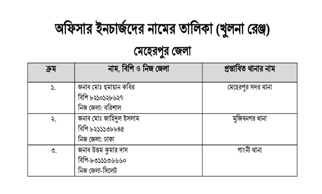 আসন্ন ত্রয়োদশ নির্বাচনকে সামনে রেখে দেশের ৬৪ জেলায় সকল থানার অফিসার ইনচার্জ (ওসি) বদলি করা হয়েছে। মেহেরপুরের তিন থানায়ও নতুন ওসি পদায়ন করা হয়েছে। এর মধ্যে সদর থানায় হুমায়ন কবির, গাংনী থানায় উত্তম কুমার দাস এবং মুজিবনগর থানায় জাহিদুল ইসলামকে ওসি হিসেবে পদায়ন করা হয়েছে।